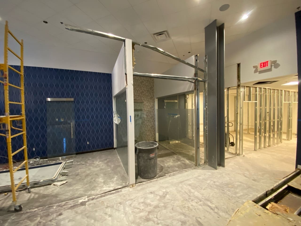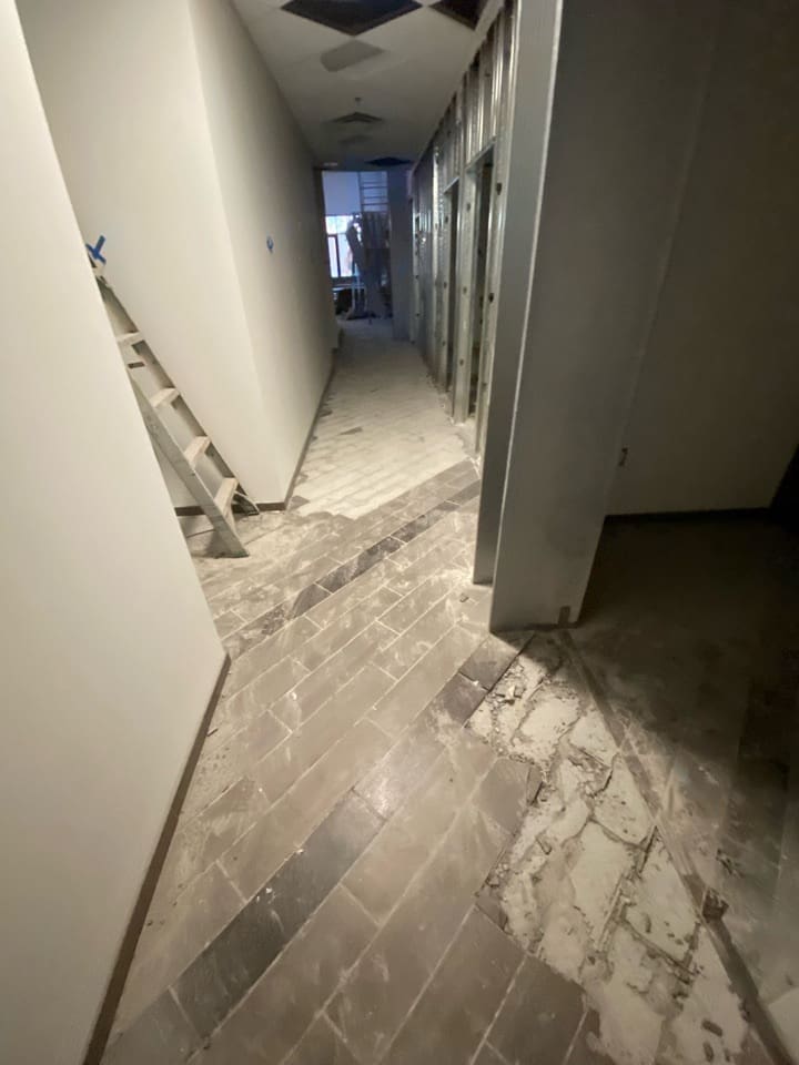 - Demolition: Removal of existing tile, carpet, stage platform, interior walls, and select doors