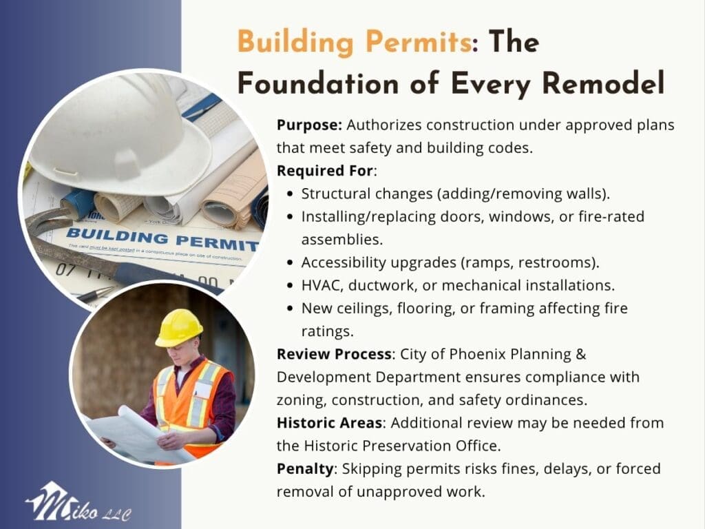 A building permit is the cornerstone of all commercial remodeling in Phoenix. This official document authorizes construction according to approved plans that meet building and safety codes. Without one, you risk fines or having to undo the work.